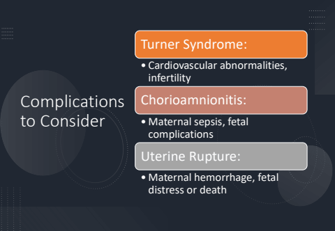 Complications to ConsiderTurner Syndrome:%u2022 Cardiovascular abnormalities, infertilityChorioamnionitis:%u2022 Maternal sepsis, fetal complicationsUterine Rupture:%u2022 Maternal hemorrhage, fetal distress or death