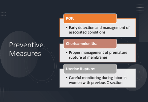 Preventive Measures%u2022 Early detection and management of associated conditionsPOF:%u2022 Proper management of premature rupture of membranesChorioamnionitis:%u2022 Careful monitoring during labor in women with previous C-sectionUterine Rupture: