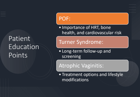 Patient Education PointsPOF:%u2022 Importance of HRT, bone health, and cardiovascular riskTurner Syndrome:%u2022 Long-term follow-up and screeningAtrophic Vaginitis:%u2022 Treatment options and lifestyle modifications