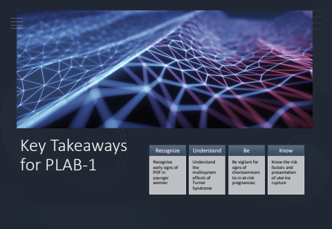 Key Takeaways for PLAB-1RecognizeRecognize early signs of POF in younger womenUnderstandUnderstand the multisystem effects of Turner SyndromeBeBe vigilant for signs of chorioamnionitis in at-risk pregnanciesKnowKnow the risk factors and presentation of uterine rupture