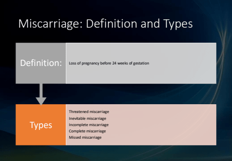 Miscarriage: Definition and TypesTypesThreatened miscarriageInevitable miscarriageIncomplete miscarriageComplete miscarriageMissed miscarriageDefinition: Loss of pregnancy before 24 weeks of gestation