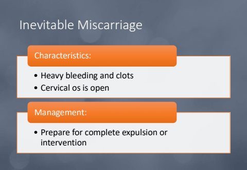 Inevitable Miscarriage%u2022 Heavy bleeding and clots%u2022 Cervical os is openCharacteristics:%u2022 Prepare for complete expulsion or interventionManagement: