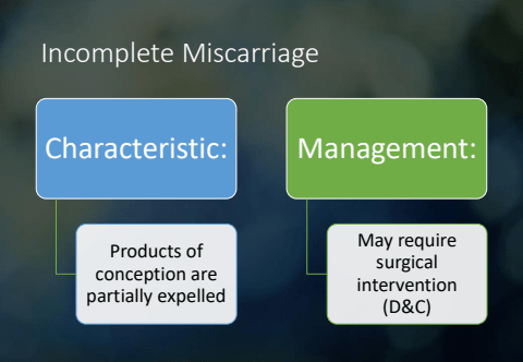 Incomplete MiscarriageCharacteristic:Products of conception are partially expelledManagement:May require surgical intervention (D&C)