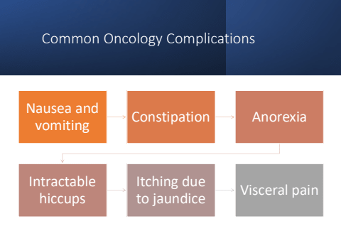 Common Oncology ComplicationsNausea and vomiting Constipation AnorexiaIntractable hiccupsItching due to jaundice Visceral pain