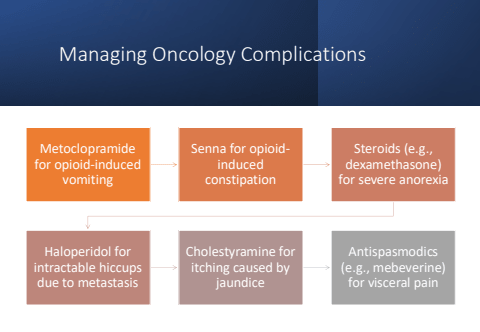 Managing Oncology ComplicationsMetoclopramide for opioid-induced vomitingSenna for opioidinduced constipationSteroids (e.g., dexamethasone) for severe anorexiaHaloperidol for intractable hiccups due to metastasisCholestyramine for itching caused by jaundiceAntispasmodics (e.g., mebeverine) for visceral pain