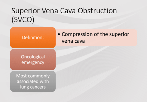 Superior Vena Cava Obstruction (SVCO)%u2022 Compression of the superior vena cavaDefinition:Oncological emergencyMost commonly associated with lung cancers