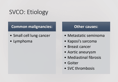 SVCO: EtiologyCommon malignancies:%u2022 Small cell lung cancer%u2022 LymphomaOther causes:%u2022 Metastatic seminoma%u2022 Kaposi's sarcoma%u2022 Breast cancer%u2022 Aortic aneurysm%u2022 Mediastinal fibrosis%u2022 Goiter%u2022 SVC thrombosis