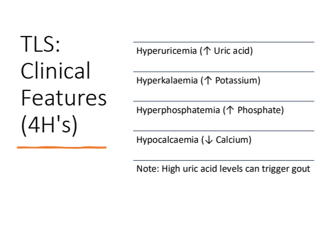 TLS: Clinical Features (4H's)Hyperuricemia (%u2191 Uric acid)Hyperkalaemia (%u2191 Potassium)Hyperphosphatemia (%u2191 Phosphate)Hypocalcaemia (%u2193 Calcium)Note: High uric acid levels can trigger gout