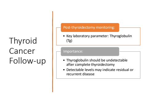 Thyroid Cancer Follow-up%u2022 Key laboratory parameter: Thyroglobulin (Tg)Post-thyroidectomy monitoring:%u2022 Thyroglobulin should be undetectable after complete thyroidectomy%u2022 Detectable levels may indicate residual or recurrent diseaseImportance: