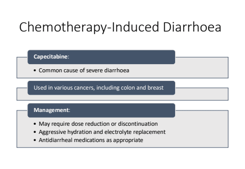 Chemotherapy-Induced Diarrhoea%u2022 Common cause of severe diarrhoeaCapecitabine:Used in various cancers, including colon and breast%u2022 May require dose reduction or discontinuation%u2022 Aggressive hydration and electrolyte replacement%u2022 Antidiarrheal medications as appropriateManagement: