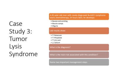 Case Study 3: Tumor Lysis SyndromeA 45-year-old man with newly diagnosed Burkitt's lymphoma starts chemotherapy. 24 hours later, he develops:%u2022 Nausea and vomiting%u2022 Muscle cramps%u2022 OliguriaLab results sho%u2022 %u2191 Potassium%u2022 %u2191 Phosphate%u2022 %u2191 Uric acid%u2022 %u2193 CalciumWhat is the diagnosis?What is the main risk associated with this condition?Name two important management steps.