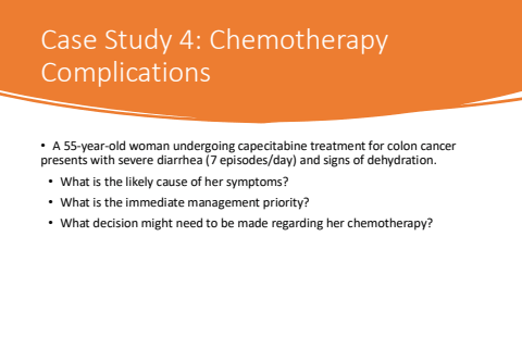Case Study 4: Chemotherapy Complications%u2022 A 55-year-old woman undergoing capecitabine treatment for colon cancer presents with severe diarrhea (7 episodes/day) and signs of dehydration.%u2022 What is the likely cause of her symptoms?%u2022 What is the immediate management priority?%u2022 What decision might need to be made regarding her chemotherapy?