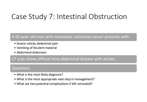 Case Study 7: Intestinal ObstructionA 65-year-old man with metastatic colorectal cancer presents with:%u2022 Severe colicky abdominal pain%u2022 Vomiting of feculent material%u2022 Abdominal distensionCT scan shows diffuse intra-abdominal disease with ascites.Questions:%u2022 What is the most likely diagnosis?%u2022 What is the most appropriate next step in management?%u2022 What are two potential complications if left untreated?