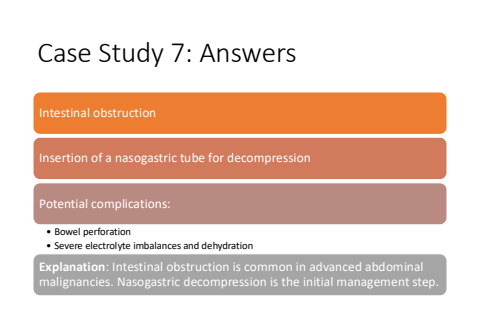 Case Study 7: AnswersIntestinal obstructionInsertion of a nasogastric tube for decompressionPotential complications:%u2022 Bowel perforation%u2022 Severe electrolyte imbalances and dehydrationExplanation: Intestinal obstruction is common in advanced abdominal malignancies. Nasogastric decompression is the initial management step.