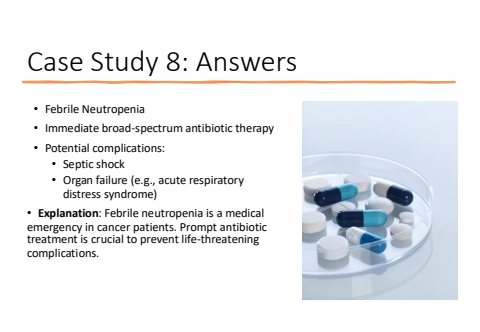 Case Study 8: Answers%u2022 Febrile Neutropenia%u2022 Immediate broad-spectrum antibiotic therapy%u2022 Potential complications:%u2022 Septic shock%u2022 Organ failure (e.g., acute respiratory distress syndrome)%u2022 Explanation: Febrile neutropenia is a medical emergency in cancer patients. Prompt antibiotic treatment is crucial to prevent life-threatening complications.