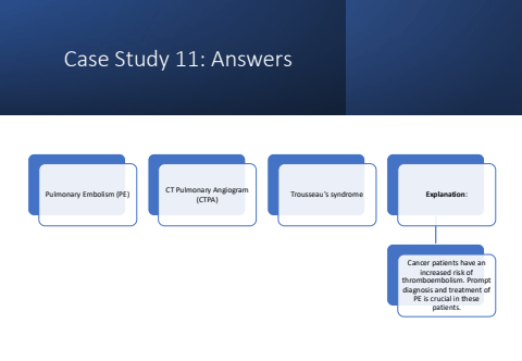 Case Study 11: AnswersPulmonary Embolism (PE) CT Pulmonary Angiogram (CTPA) Trousseau's syndrome Explanation:Cancer patients have an increased risk of thromboembolism. Prompt diagnosis and treatment of PE is crucial in these patients.