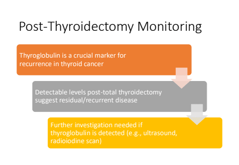 Post-Thyroidectomy MonitoringThyroglobulin is a crucial marker for recurrence in thyroid cancerDetectable levels post-total thyroidectomy suggest residual/recurrent diseaseFurther investigation needed if thyroglobulin is detected (e.g., ultrasound, radioiodine scan)