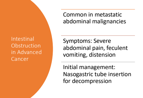 Intestinal Obstruction in Advanced CancerCommon in metastatic abdominal malignanciesSymptoms: Severe abdominal pain, feculent vomiting, distensionInitial management: Nasogastric tube insertion for decompression
