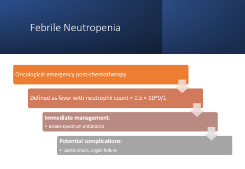 Febrile NeutropeniaOncological emergency post-chemotherapyDefined as fever with neutrophil count < 0.5 %u00d7 10^9/LImmediate management:%u2022 Broad-spectrum antibioticsPotential complications:%u2022 Septic shock, organ failure