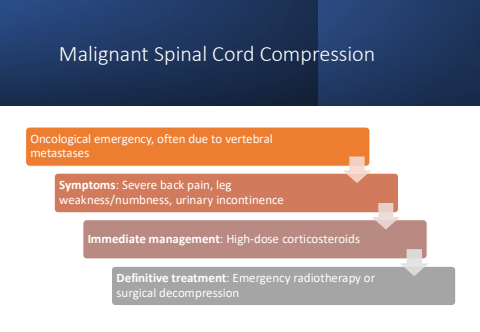 Malignant Spinal Cord CompressionOncological emergency, often due to vertebral metastasesSymptoms: Severe back pain, leg weakness/numbness, urinary incontinenceImmediate management: High-dose corticosteroidsDefinitive treatment: Emergency radiotherapy or surgical decompression