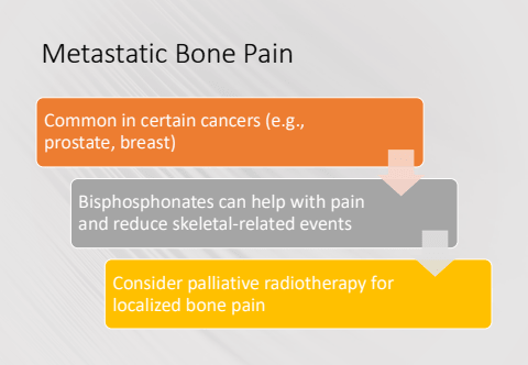 Metastatic Bone PainCommon in certain cancers (e.g., prostate, breast)Bisphosphonates can help with pain and reduce skeletal-related eventsConsider palliative radiotherapy for localized bone pain