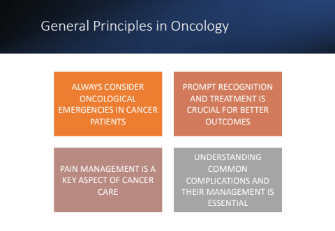 General Principles in OncologyALWAYS CONSIDER ONCOLOGICAL EMERGENCIES IN CANCER PATIENTSPROMPT RECOGNITION AND TREATMENT IS CRUCIAL FOR BETTER OUTCOMESPAIN MANAGEMENT IS A KEY ASPECT OF CANCER CAREUNDERSTANDING COMMON COMPLICATIONS AND THEIR MANAGEMENT IS ESSENTIAL