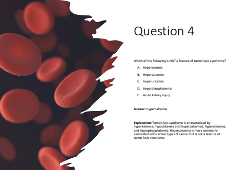 Question 4Which of the following is NOT a feature of tumor lysis syndrome?A. HyperkalemiaB. HypercalcemiaC. HyperuricemiaD. HyperphosphatemiaE. Acute kidney injuryAnswer: HypercalcemiaExplanation: Tumor lysis syndrome is characterized by hyperkalemia, hypocalcemia (not hypercalcemia), hyperuricemia, and hyperphosphatemia. Hypercalcemia is more commonly associated with certain types of cancer but is not a feature of tumor lysis syndrome.
