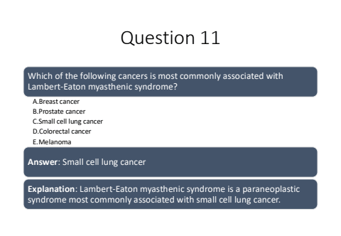 Question 11Which of the following cancers is most commonly associated with Lambert-Eaton myasthenic syndrome?A.Breast cancerB.Prostate cancerC.Small cell lung cancerD.Colorectal cancerE.MelanomaAnswer: Small cell lung cancerExplanation: Lambert-Eaton myasthenic syndrome is a paraneoplastic syndrome most commonly associated with small cell lung cancer.