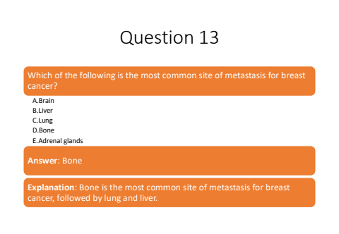 Question 13Which of the following is the most common site of metastasis for breast cancer?A.BrainB.LiverC.LungD.BoneE.Adrenal glandsAnswer: BoneExplanation: Bone is the most common site of metastasis for breast cancer, followed by lung and liver.