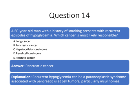 Question 14A 60-year-old man with a history of smoking presents with recurrent episodes of hypoglycemia. Which cancer is most likely responsible?A.Lung cancerB.Pancreatic cancerC.Hepatocellular carcinomaD.Renal cell carcinomaE.Prostate cancerAnswer: Pancreatic cancerExplanation: Recurrent hypoglycemia can be a paraneoplastic syndrome associated with pancreatic islet cell tumors, particularly insulinomas.