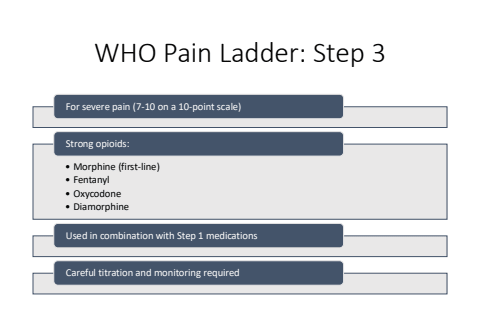 WHO Pain Ladder: Step 3For severe pain (7-10 on a 10-point scale)%u2022 Morphine (first-line)%u2022 Fentanyl%u2022 Oxycodone%u2022 DiamorphineStrong opioids:Used in combination with Step 1 medicationsCareful titration and monitoring required