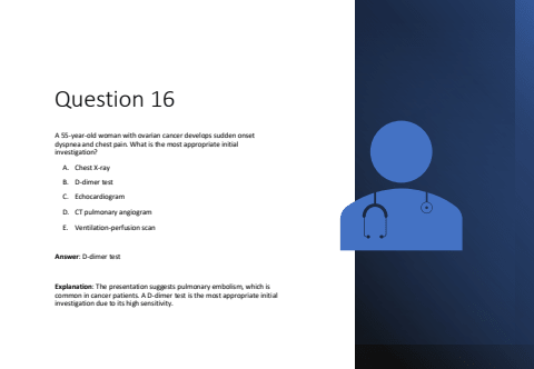 Question 16A 55-year-old woman with ovarian cancer develops sudden onset dyspnea and chest pain. What is the most appropriate initial investigation?A. Chest X-rayB. D-dimer testC. EchocardiogramD. CT pulmonary angiogramE. Ventilation-perfusion scanAnswer: D-dimer testExplanation: The presentation suggests pulmonary embolism, which is common in cancer patients. A D-dimer test is the most appropriate initial investigation due to its high sensitivity.