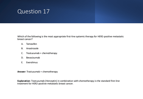 Question 17Which of the following is the most appropriate first-line systemic therapy for HER2-positive metastatic breast cancer?A. TamoxifenB. AnastrozoleC. Trastuzumab + chemotherapyD. BevacizumabE. EverolimusAnswer: Trastuzumab + chemotherapyExplanation: Trastuzumab (Herceptin) in combination with chemotherapy is the standard first-line treatment for HER2-positive metastatic breast cancer.