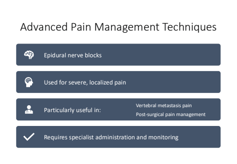 Advanced Pain Management TechniquesEpidural nerve blocksUsed for severe, localized painParticularly useful in:Vertebral metastasis painPost-surgical pain managementRequires specialist administration and monitoring