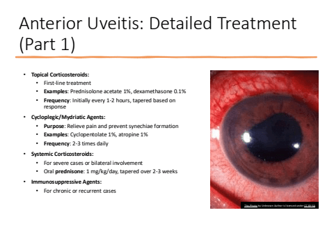 Anterior Uveitis: Detailed Treatment (Part 1)%u2022 Topical Corticosteroids:%u2022 First-line treatment%u2022 Examples: Prednisolone acetate 1%, dexamethasone 0.1%%u2022 Frequency: Initially every 1-2 hours, tapered based on response%u2022 Cycloplegic/Mydriatic Agents:%u2022 Purpose: Relieve pain and prevent synechiae formation%u2022 Examples: Cyclopentolate 1%, atropine 1%%u2022 Frequency: 2-3 times daily%u2022 Systemic Corticosteroids:%u2022 For severe cases or bilateral involvement%u2022 Oral prednisone: 1 mg/kg/day, tapered over 2-3 weeks%u2022 Immunosuppressive Agents:%u2022 For chronic or recurrent casesThis Photo by Unknown Author is licensed under CC BY-SA