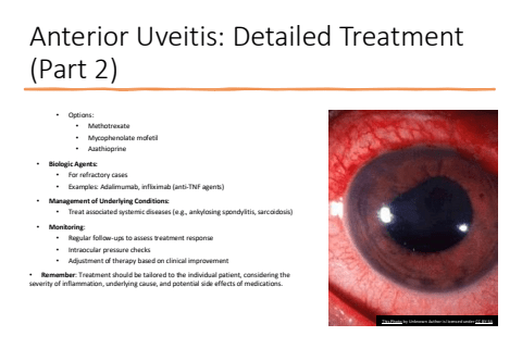Anterior Uveitis: Detailed Treatment (Part 2)%u2022 Options:%u2022 Methotrexate%u2022 Mycophenolate mofetil%u2022 Azathioprine%u2022 Biologic Agents:%u2022 For refractory cases%u2022 Examples: Adalimumab, infliximab (anti-TNF agents)%u2022 Management of Underlying Conditions:%u2022 Treat associated systemic diseases (e.g., ankylosing spondylitis, sarcoidosis)%u2022 Monitoring:%u2022 Regular follow-ups to assess treatment response%u2022 Intraocular pressure checks%u2022 Adjustment of therapy based on clinical improvement%u2022 Remember: Treatment should be tailored to the individual patient, considering the severity of inflammation, underlying cause, and potential side effects of medications.This Photo by Unknown Author is licensed under CC BY-SA