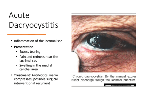 Acute Dacryocystitis%u2022 Inflammation of the lacrimal sac%u2022 Presentation:%u2022 Excess tearing%u2022 Pain and redness near the lacrimal sac%u2022 Swelling in the medial canthal area%u2022 Treatment: Antibiotics, warm compresses, possible surgical intervention if recurrentThis Photo by Unknown Author is licensed under CC BY