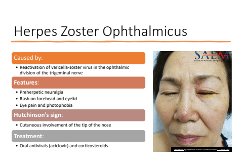 Herpes Zoster OphthalmicusCaused by:%u2022 Reactivation of varicella-zoster virus in the ophthalmic division of the trigeminal nerveFeatures:%u2022 Preherpetic neuralgia%u2022 Rash on forehead and eyelid%u2022 Eye pain and photophobiaHutchinson's sign:%u2022 Cutaneous involvement of the tip of the noseTreatment:%u2022 Oral antivirals (aciclovir) and corticosteroidsThis Photo by Unknown Author is licensed under CC BY-NC-ND