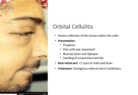 Orbital Cellulitis%u2022 Serious infection of the tissues within the orbit%u2022 Presentation:%u2022 Proptosis%u2022 Pain with eye movement%u2022 Blurred vision and diplopia%u2022 Swelling of conjunctiva and lids%u2022 Best initial test: CT scan of orbit and brain%u2022 Treatment: Emergency referral and IV antibioticsThis Photo by Unknown Author is licensed under CC BY