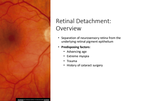 Retinal Detachment: Overview%u2022 Separation of neurosensory retina from the underlying retinal pigment epithelium%u2022 Predisposing factors:%u2022 Advancing age%u2022 Extreme myopia%u2022 Trauma%u2022 History of cataract surgeryThis Photo by Unknown Author is licensed under CC BY-NC