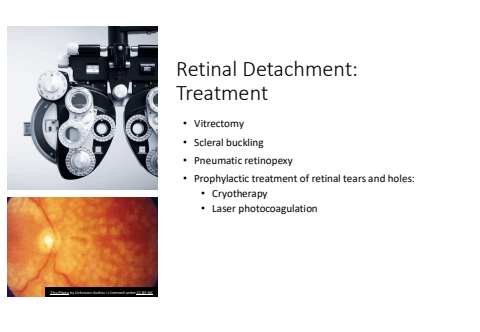 Retinal Detachment: Treatment%u2022 Vitrectomy%u2022 Scleral buckling%u2022 Pneumatic retinopexy%u2022 Prophylactic treatment of retinal tears and holes:%u2022 Cryotherapy%u2022 Laser photocoagulationThis Photo by Unknown Author is licensed under CC BY-NC