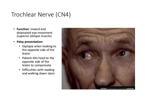 Trochlear Nerve (CN4)%u2022 Function: Inward and downward eye movement (superior oblique muscle)%u2022 Palsy presentation:%u2022 Diplopia when looking to the opposite side of the lesion%u2022 Patient tilts head to the opposite side of the lesion to compensate%u2022 Difficulties with reading and walking down stairsThis Photo by Unknown Author is licensed under CC BY-NC-ND