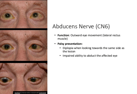 Abducens Nerve (CN6)%u2022 Function: Outward eye movement (lateral rectus muscle)%u2022 Palsy presentation:%u2022 Diplopia when looking towards the same side as the lesion%u2022 Impaired ability to abduct the affected eyeThis Photo by Unknown Author is licensed under CC BY-NC-ND