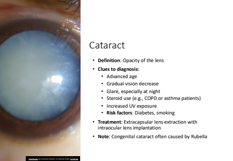 Cataract%u2022 Definition: Opacity of the lens%u2022 Clues to diagnosis:%u2022 Advanced age%u2022 Gradual vision decrease%u2022 Glare, especially at night%u2022 Steroid use (e.g., COPD or asthma patients)%u2022 Increased UV exposure%u2022 Risk factors: Diabetes, smoking%u2022 Treatment: Extracapsular lens extraction with intraocular lens implantation%u2022 Note: Congenital cataract often caused by RubellaThis Photo by Unknown Author is licensed under CC BY-SA