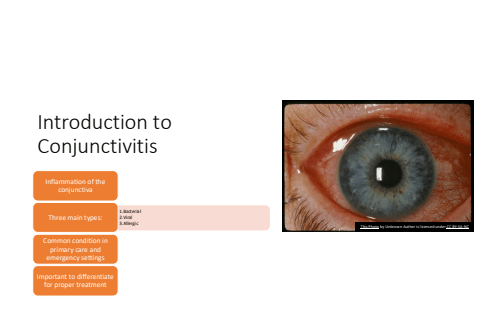 Introduction to ConjunctivitisInflammation of the conjunctiva1.Bacterial2.Viral3.AllergicThree main types:Common condition in primary care and emergency settingsImportant to differentiate for proper treatmentThis Photo by Unknown Author is licensed under CC BY-SA-NC