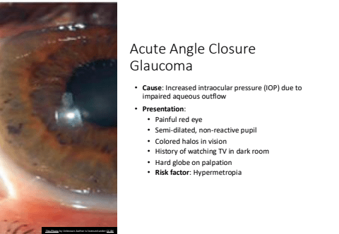 Acute Angle Closure Glaucoma%u2022 Cause: Increased intraocular pressure (IOP) due to impaired aqueous outflow%u2022 Presentation:%u2022 Painful red eye%u2022 Semi-dilated, non-reactive pupil%u2022 Colored halos in vision%u2022 History of watching TV in dark room%u2022 Hard globe on palpation%u2022 Risk factor: HypermetropiaThis Photo by Unknown Author is licensed under CC BY