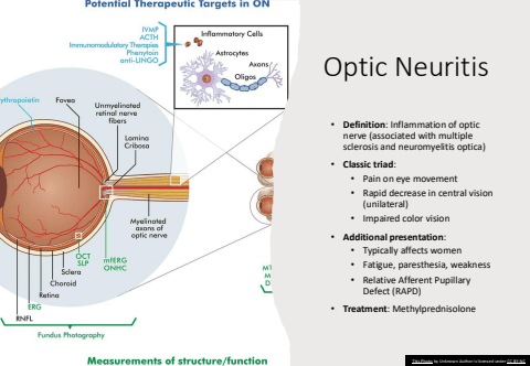 Optic Neuritis%u2022 Definition: Inflammation of optic nerve (associated with multiple sclerosis and neuromyelitis optica)%u2022 Classic triad:%u2022 Pain on eye movement%u2022 Rapid decrease in central vision (unilateral)%u2022 Impaired color vision%u2022 Additional presentation:%u2022 Typically affects women%u2022 Fatigue, paresthesia, weakness%u2022 Relative Afferent Pupillary Defect (RAPD)%u2022 Treatment: MethylprednisoloneThis Photo by Unknown Author is licensed under CC BY-NC
