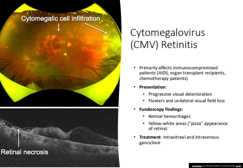 Cytomegalovirus (CMV) Retinitis%u2022 Primarily affects immunocompromised patients (AIDS, organ transplant recipients, chemotherapy patients)%u2022 Presentation:%u2022 Progressive visual deterioration%u2022 Floaters and unilateral visual field loss%u2022 Fundoscopy findings:%u2022 Retinal hemorrhages%u2022 Yellow-white areas (\of retina)%u2022 Treatment: Intravitreal and intravenous ganciclovirThis Photo by Unknown Author is licensed under CC BY