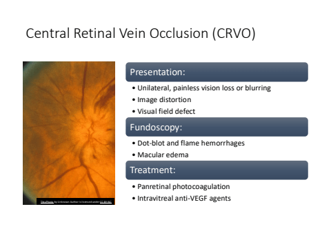 Central Retinal Vein Occlusion (CRVO)Presentation:%u2022 Unilateral, painless vision loss or blurring%u2022 Image distortion%u2022 Visual field defectFundoscopy:%u2022 Dot-blot and flame hemorrhages%u2022 Macular edemaTreatment:%u2022 Panretinal photocoagulation%u2022 Intravitreal anti-VEGF agents This Photo by Unknown Author is licensed under CC BY-NC