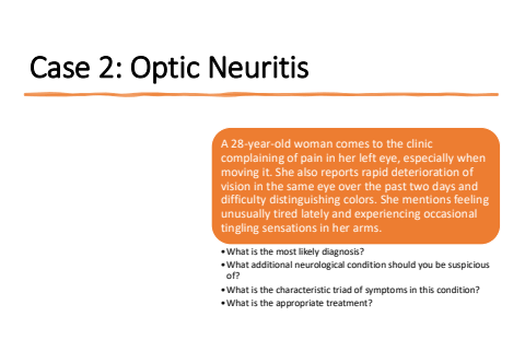 Case 2: Optic NeuritisA 28-year-old woman comes to the clinic complaining of pain in her left eye, especially when moving it. She also reports rapid deterioration of vision in the same eye over the past two days and difficulty distinguishing colors. She mentions feeling unusually tired lately and experiencing occasional tingling sensations in her arms.%u2022What is the most likely diagnosis?%u2022What additional neurological condition should you be suspicious of?%u2022What is the characteristic triad of symptoms in this condition?%u2022What is the appropriate treatment?